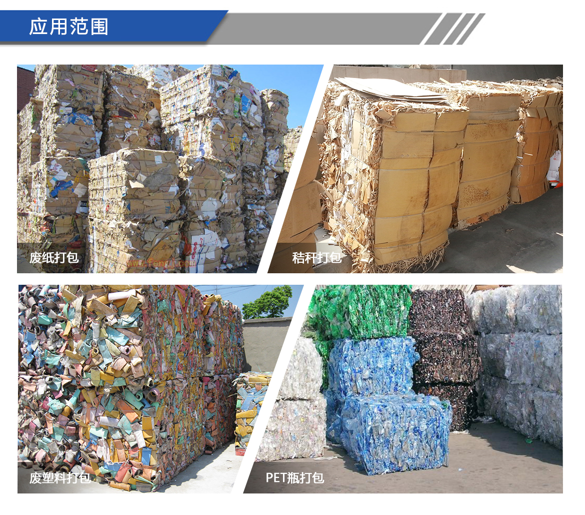 適用于廢紙(紙板箱、新聞紙等),廢塑料(PET瓶、塑料膜、周轉箱等)、秸稈等松散的打包及自動捆扎。